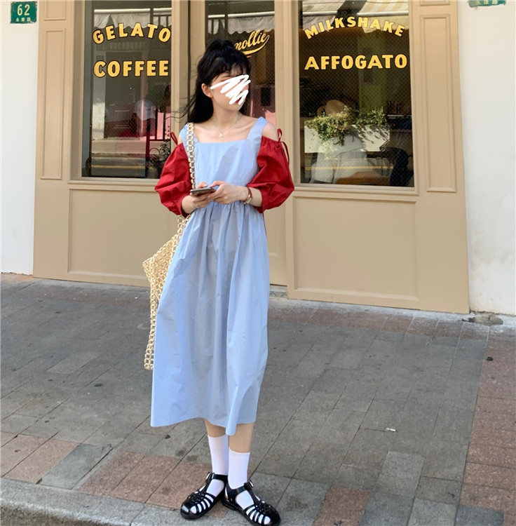 实拍 实价 撞色设计拼接显瘦绑带露肩连衣裙热门设计联盟服务商